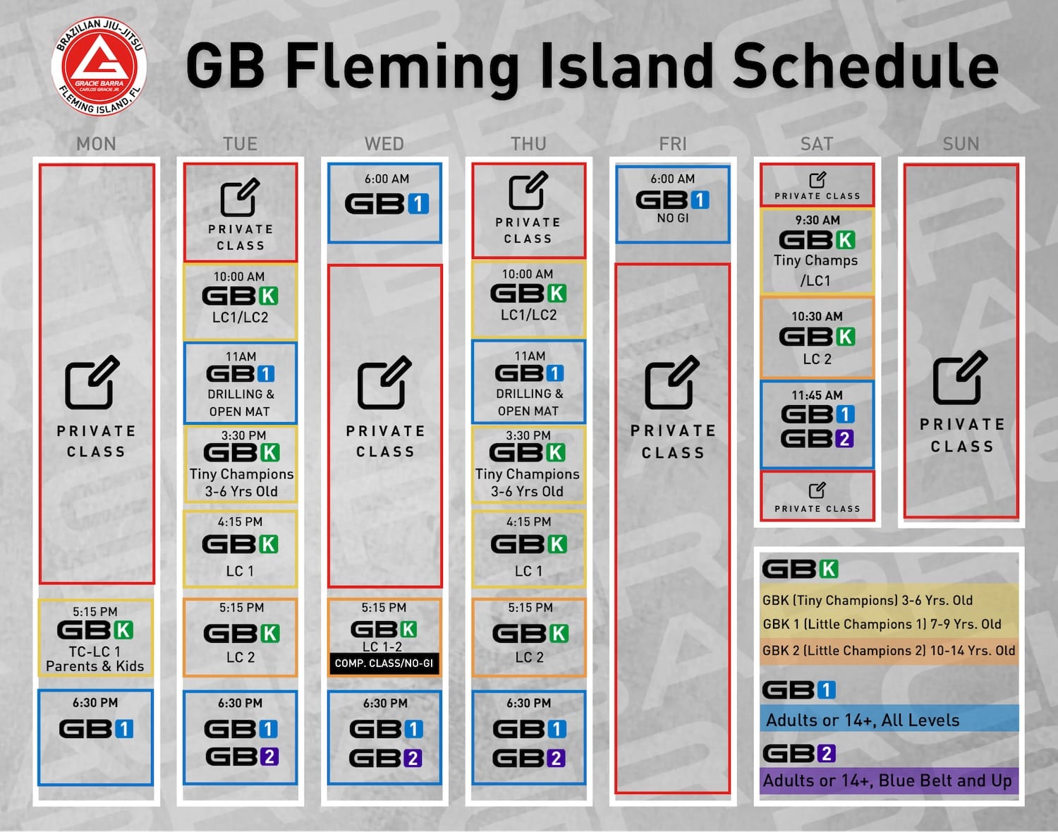 Our schedule will change as our academy grows. Check back occasionally to see if there are updates to our class schedule. If this is your first time, please arrive 15 minutes before schedule so that we may fit you in a loaner uniform if you do not have one.